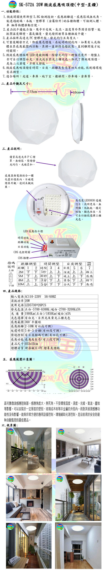 20W微波感應吸頂燈(中型-星鑽)