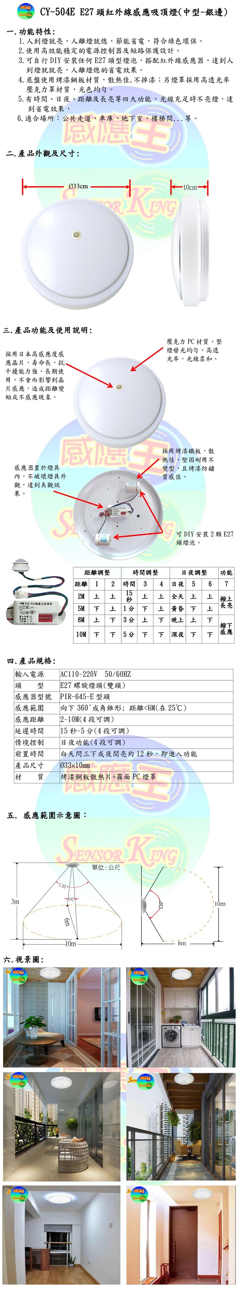 E27頭紅外線感應吸頂燈(中型-銀邊)