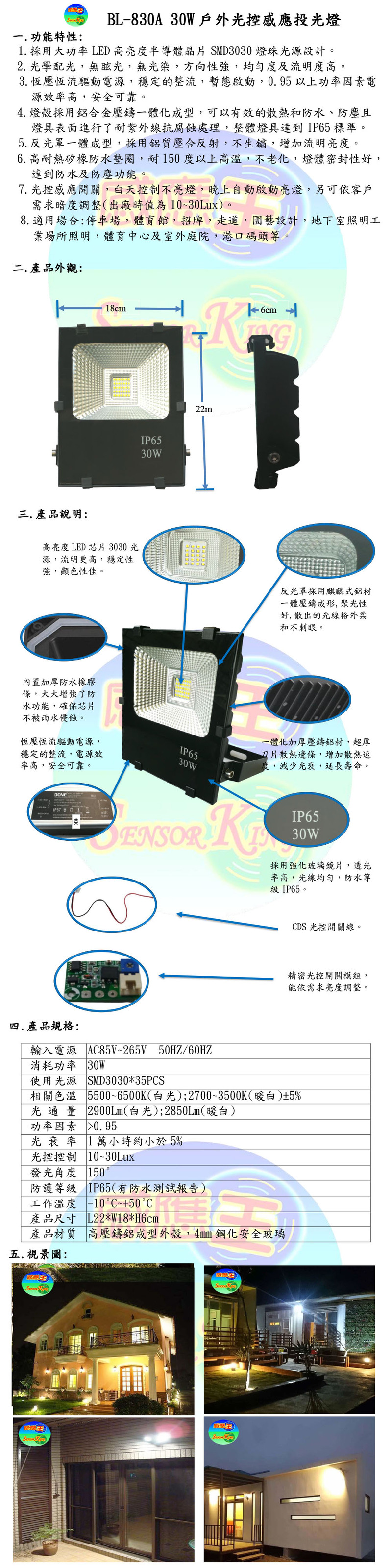 30W戶外光控感應投光燈
