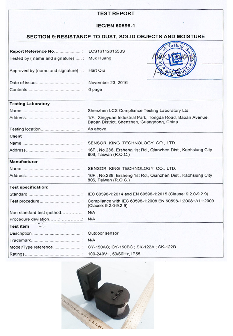 紅外線感應器防水證書